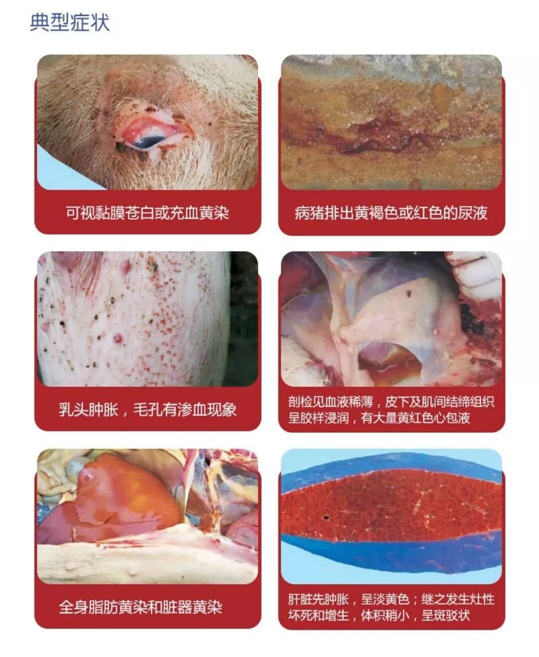 附红细胞体常与弓形体病相伴发生,病死率极高。临床主要表症:发病初期仔猪体温升高,精神不振,食欲减退,呼吸困难,可视黏膜黄染、苍白,随后出现死亡病例;成年猪体温升高,腹股沟淋巴结肿大,股内侧、下腹、耳翼出现紫红班和出血点,流鼻涕,眼结膜、皮肤苍白,眼内出现浆液性或脓性分泌物,怀孕母猪流产、产死胎,育肥猪后期突然死亡。近年来附红细胞体和弓形体病混合感染的临床病例呈显著上升趋势,甚至出现整个猪场蔓延的情况,给生猪养殖生产造成了极大的损失。