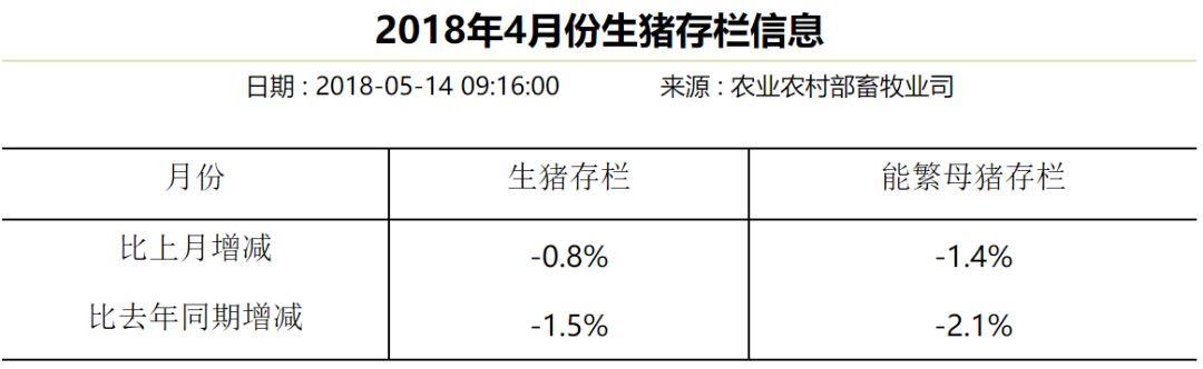 我们知道,4月统计信息显示,能繁母猪存栏量环比减少1.4%,同比减少2.1%;生猪存栏环比减少0.8%,同比减少1.5%。